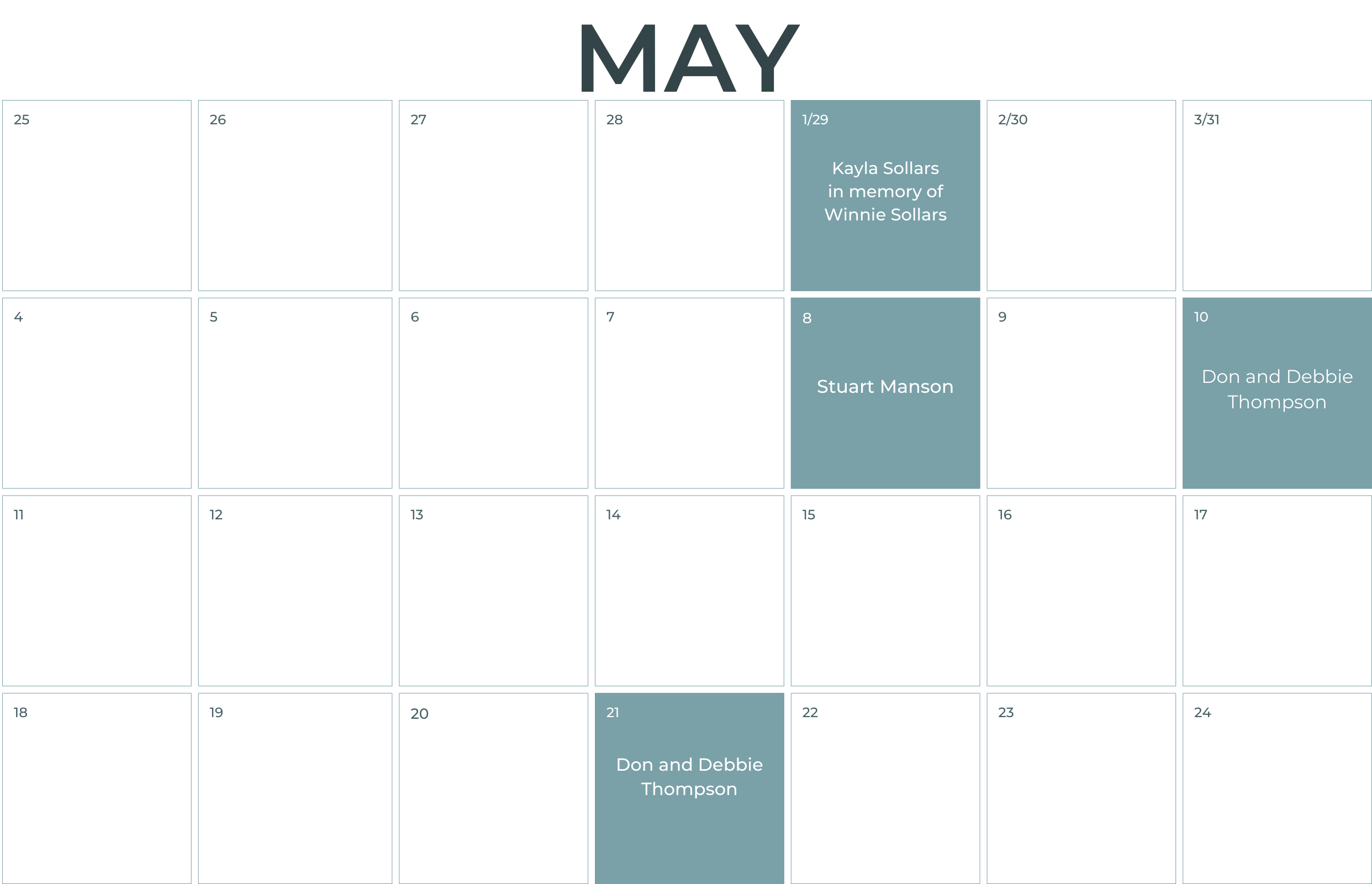 For those ready to make this commitment, your sponsored days can be covered through a one-time gift via check, cash, or online by credit card.